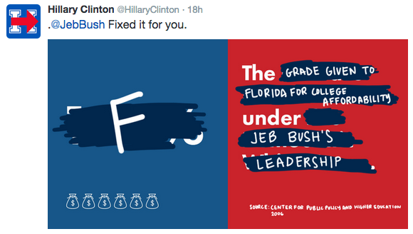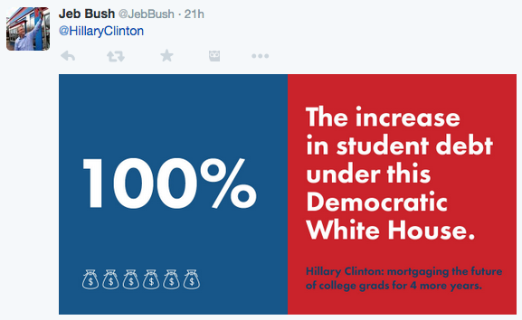 Republican primary candidate and former Florida Gov. Jeb Bush was quick to respond back to Clinton with his own take and an updated image alleging student debt increased 100 percent under the Obama administration: