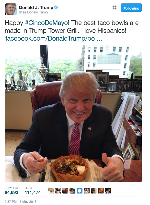 On Cinco de Mayo, Trump tweeted a photo of him eating a taco bowl, saying how the best tacos are made in Trump Tower.