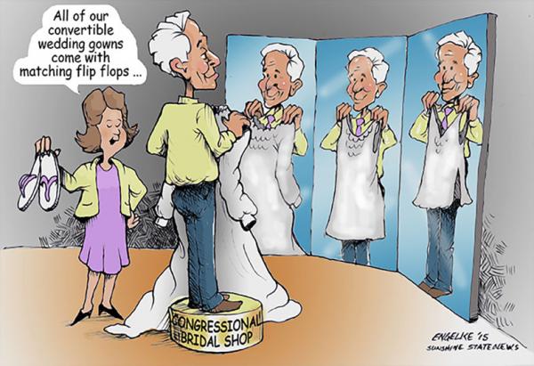 He'll be for clean air, clean water, clean energy -- you know, "the environment." He'll be for cheap gas, good public schools, more stringent gun laws, blah, blah and blah. Just don't expect him to elaborate past party talking points. All-purpose platitudes slickly delivered -- that's Charlie's schtick. It's Charlie making full use of his wedding dress.