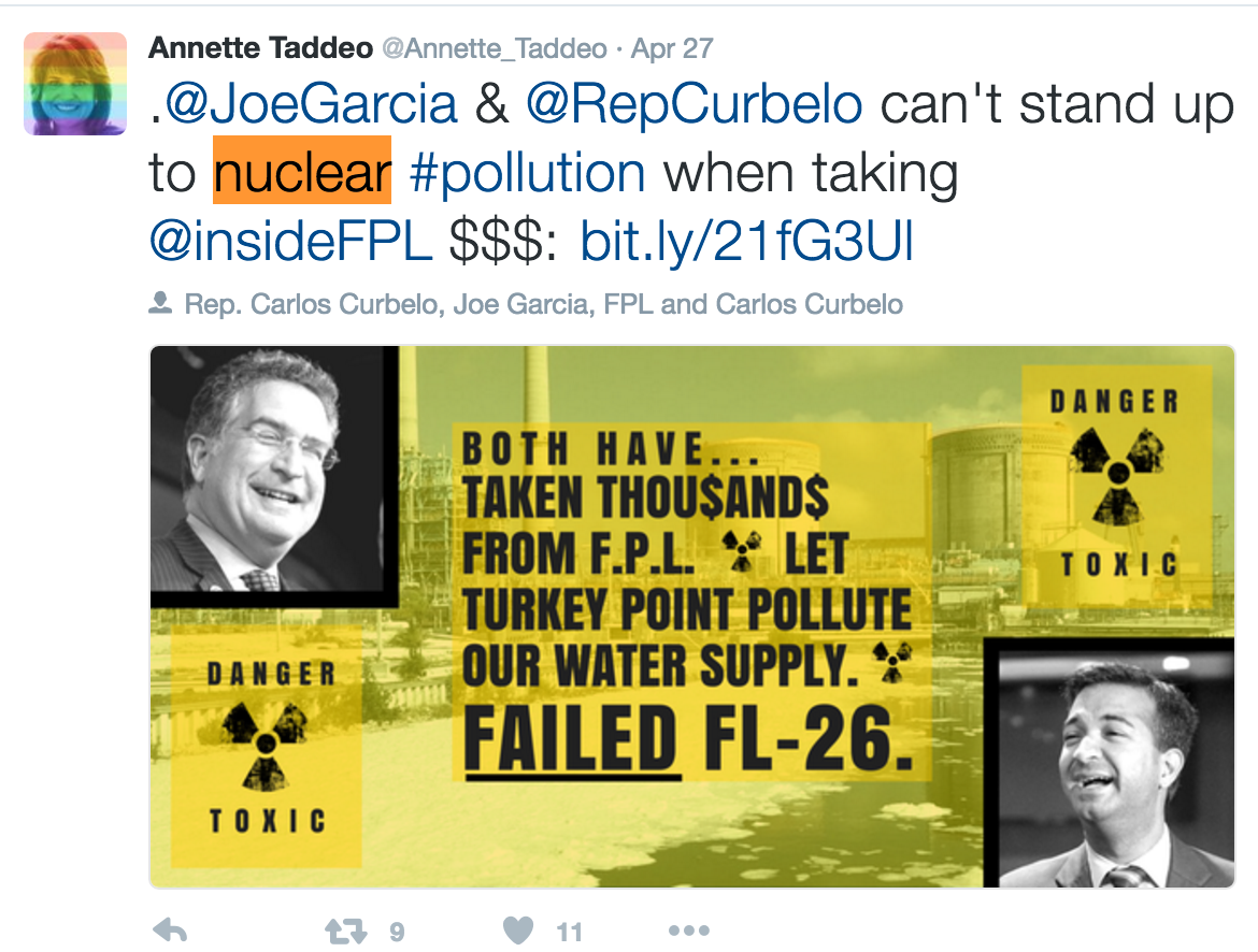 Taddeo runs with the same theme in a tweet aiming to "out" Garcia and Curbelo for taking money from Florida Power & Light Co. Check it out: