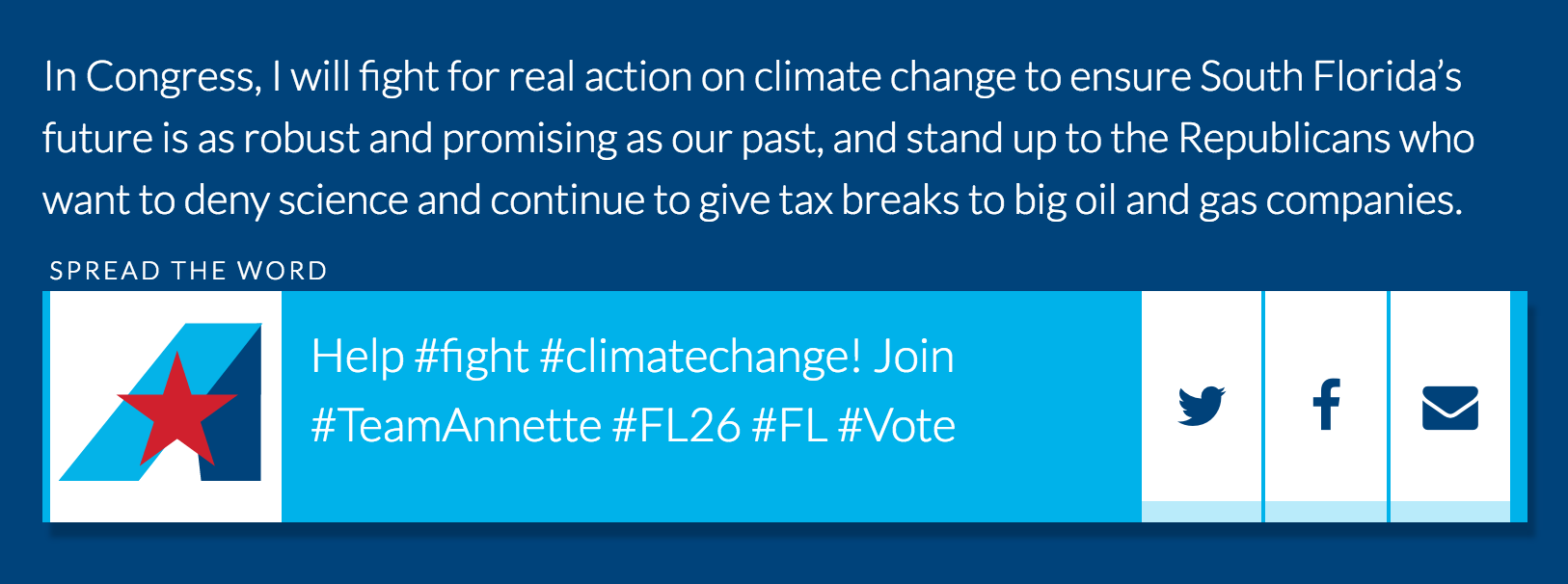 Her on-line plea for money includes this: "In Congress, I will fight for real action on climate change to ensure South Florida's future is as robust and promising as our past, and stand up to the Republicans who want to deny science and continue to give tax breaks to big oil and gas companies. ... Help #fight #climatechange! Join #TeamAnnette #FL26 #FL #Vote